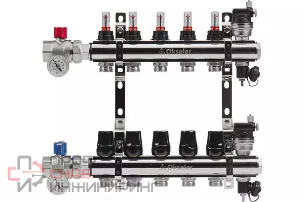 Латунный коллекторный блок OKSELER с расходомерами и автоматическими воздухоотводчикамиПрофессиональное решение для систем водяного отопления и теплых полов. Коллектор из латуни CW617N обеспечивает равномерное распределение теплоносителя по контурам с точным контролем расхода и температуры. В комплекте расходомеры, термометры и автоматические воздухоотводчики.