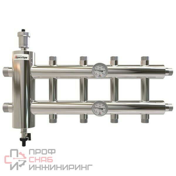 Предназначен для обустройства систем отопления с пятью потребителями тепла с различными параметрами расхода и температуры теплоносителя. Состоит из подающего и обратного коллекторов, расположенных друг над другом и встроенного гидравлического разделителя. Коллектор со встроенной гидрострелкой значительно упрощает и ускоряет монтаж системы отопления, это готовое изделие с минимумом разборных соединений значительно повышает надежность системы.Коллектор и гидрострелка спроектированы на самом предприятии Прокситерм, изготовлены на автоматизированных линиях, проверены перед упаковкой. Это позволяет обеспечить правильную работу системы отопления и увязать работу нескольких насосов на контурах.
