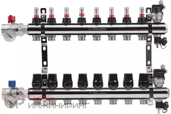 Латунный коллекторный блок OKSELER с расходомерами и автоматическими воздухоотводчиками. Профессиональное решение для систем водяного отопления и теплых полов. Коллектор из латуни CW617N обеспечивает равномерное распределение теплоносителя по контурам с точным контролем расхода и температуры. В комплекте расходомеры, термометры и автоматические воздухоотводчики.