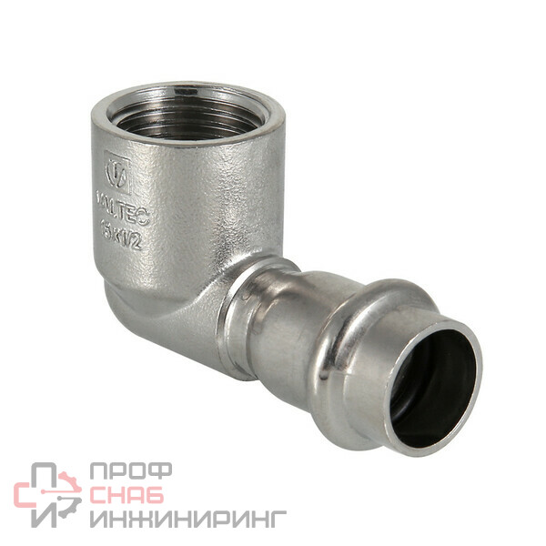 Пресс-угольник из нержавеющей стали с внутренней резьбой обеспечивает соединение тонкостенной стальной трубы с резьбовым элементом монтируемой системы под углом 90°. Область применения – трубопроводы водоснабжения, отопления, иные инженерные и технологические установки с рабочей температурой до 120 °С и давлением до 16 бар.Угловой концевой переходник VTi.952.I изготовлен из стали AISI 304. Материал уплотнения – эластомер EPDM. Отдельно можно приобрести уплотнительные кольца из FPM (витон); в этом случае максимальная рабочая температура увеличивается до 140 °С.Пресс-соединение – бесштуцерное. Обжатие производится с помощью пресс-инструмента V-профиля.
