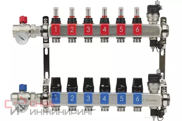 Коллекторный блок OKSELER из нержавеющей стали с расходомерами и автоматическими воздухоотводчикамиПредназначен для систем водяного отопления и теплых полов. Обеспечивает точное распределение теплоносителя по контурам, контроль расхода и температуры. Изготовлен из нержавеющей стали AISI 304 для долговечной работы в системах отопления.
