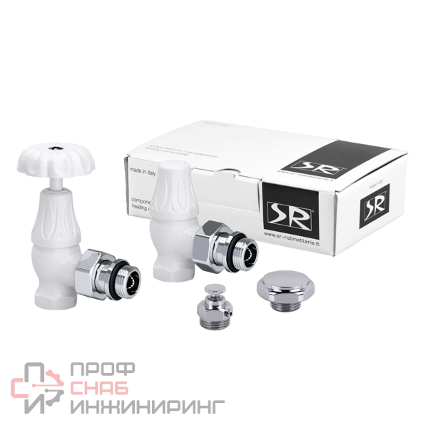 Комплект вентилей SR Rubinetterie дизайн серии Floral Old Style, состав : - вентиль на подачу угловой, ручной регулировки, соединение для железной трубы, хвостовик с герметичной прокладкой; - запорный клапан угловой, соединение для железной трубы, хвостовик с герметичной прокладкой; - заглушка для радиатора; - воздухоотводчик для радиатора.