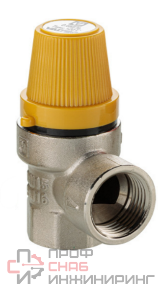 Клапан предохранительный нерегулируемый, c фиксированной заводской настройкой 1,5/3,0/6 бар (для удобства пользования введена цветовая маркировка: черный колпачок – 1,5 бара, красный – 3, желтый – 6 бар). Обеспечивает защиту от превышения давления водогрейных котлов, бойлеров, сосудов под давлением, систем отопления, напорных трубопроводов сбросом рабочей среды (вода, гликолевые незамерзающие теплоносители, воздух, природный, сжиженный газ и т.д.) в окружающую среду либо дренажный трубопровод.
