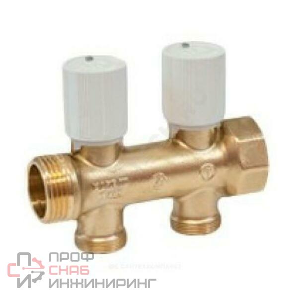Сборный коллектор, латунный, с регулирующими клапанами с рукояткой (возможна установка сервопривода), с отводами с наружной резьбой. Модель с отводами 3/4"E имеет прокладки на корпусе коллектора.