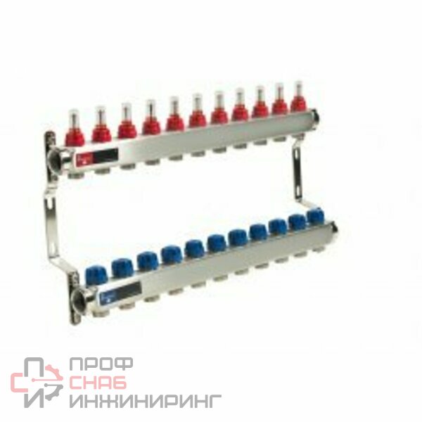 Изготовлен из нержавеющей стали с расходомерами на подающем коллекторе и термостатическими вентилями на обратном коллекторе. Термометры расположены на подающем и обратном коллекторе. Кронштейн в комплекте