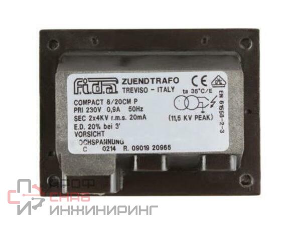 Трансформатор поджига Fida Compact 8/20 CM P Plus служит для преобразования входящего тока в ток высокого напряжения, необходимый для получения высоковольтной дуги и воспламенения топливовоздушной смеси при запуске горелки. Герметичный корпус надежно защищает электрические компоненты от внешних воздействий, пыли и влаги, отвечает европейским требованиям безопасности. Параметры электропитания: 230 В, напряжение поджига: 2х4 кВ. Для подключения к источнику питания используется штекерный разъем. Предусмотрено 2 съемных крепежа.