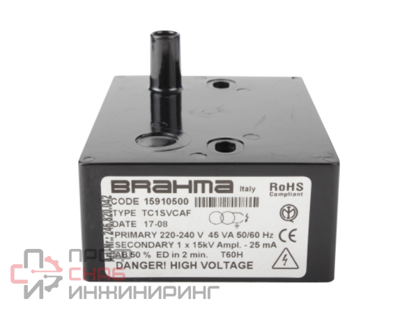 Трансформатор розжига Brahma TC1SVCAF собран в малогабаритном корпусе, оснащен противопомеховым фильтром. Отвечает требованиям директивы 2004/108/EC без применения дополнительного внешнего фильтра. Вырабатывает высоковольтное напряжение для подачи на запальный электрод и уверенного поджига топлива мощным искровым разрядом. Конструкция разработана с учетом условий эксплуатации и принимаемых нагрузок, защищена от температурных колебаний, перепадов напряжения и короткого замыкания.