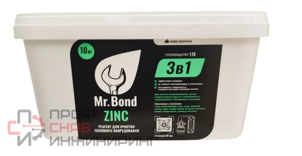 Порошковый реагент Mr.Bond ZINC предназначен для эффективной разборной и безразборной очистки котлов, теплообменников и бойлеров от ржавчины, накипи и шлама. Обеспечивает восстановление теплопередачи, повышение КПД и надёжную защиту оборудования от загрязнений. Подходит для систем отопления и горячего водоснабжения. Поставляется в фасовке на 10 л готового раствора, идеально подходит для профессионального применения.