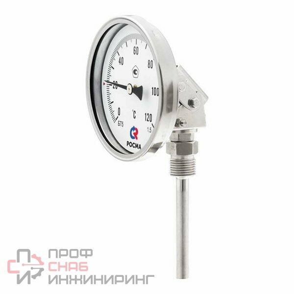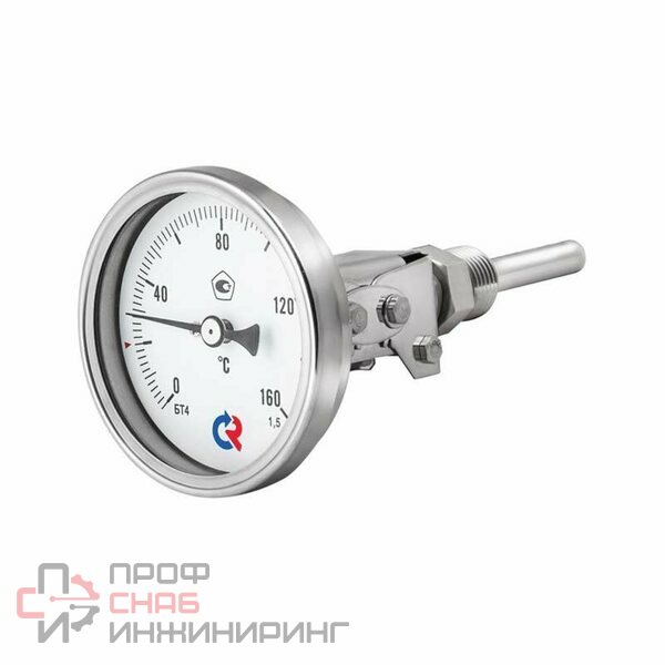 Коррозионностойкий термометр с универсальным присоединением (поворотно-откидным корпусом) с резьбой на штоке. Предназначен для измерения температуры агрессивных жидкостей и газов. Принцип действия термометров БТ основан на зависимости деформации чувствительного элемента от измеряемой температуры. В качестве чувствительного элемента используется биметаллическая пружина. Биметаллическая пружина изготавливается из двух прочно соединенных металлических пластин, имеющих различные температурные коэффициенты линейного расширения. При изменении температуры пружина изгибается и вращает стрелку термометра. Один конец пружины закреплен внутри штока, а к другому присоединяется ось стрелки.