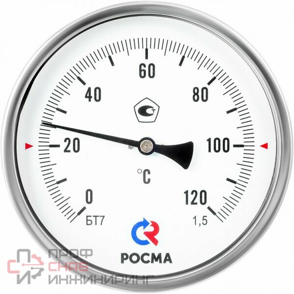 БТ-71.211 (0...200С) G1/2.250.1,5. Термометр биметаллический (осевое присоединение) в комплекте с защитной латунной погружной гильзой. Прибор предназначен для измерения температуры жидкостей, пара и газов в отопительных и санитарных установках, в системах кондиционирования и вентиляции. Принцип действия термометра основан на зависимости деформации чувствительного элемента от измеряемой температуры. В качестве чувствительного элемента используется биметаллическая пружина. Она изготавливается из двух прочно соединенных металлических пластин, имеющих различные температурные коэффициенты линейного расширения. При изменении температуры пружина изгибается и вращает стрелку термометра. Один конец пружины закреплен внутри штока, а к другому присоединяется ось стрелки. Корпус термометра изготавливается из коррозионностойкой стали, шток — из нержавеющей стали.