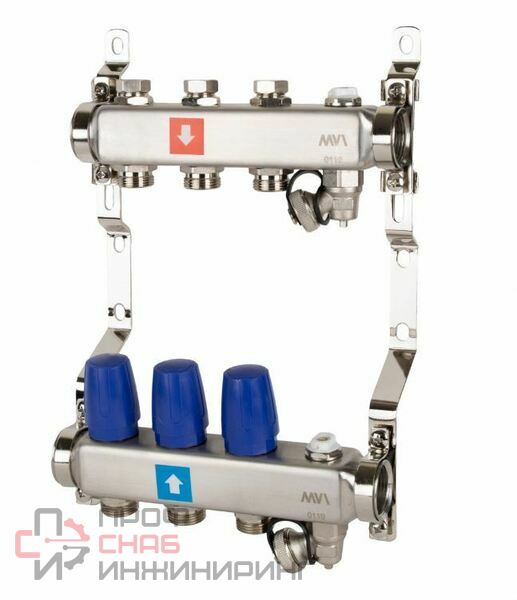 Коллекторные блоки MVI предназначены для распределения потока рабочей среды систем водяного отопления по потребителям. При этом под «потребителем» понимается отдельный нагревательный прибор или группа приборов, контур или петля «теплого пола», отдельные части или ветви системы. Коллекторный блок объединяет в себе подающий и обратный коллекторы из нержавеющей стали, запорные клапаны, термостатические клапаны (с возможностью установки электротермического сервопривода) и крепежные кронштейны. Коллекторные блоки могут работать как на водяном, так и низкозамерзающем (гликолевом) теплоносителе. Коллекторные блоки выпускаются с количеством выходов от 2 до 12. Присоединение циркуляционных петель осуществляется с помощью фитингов стандарта «евроконус» 3/4" (НР).