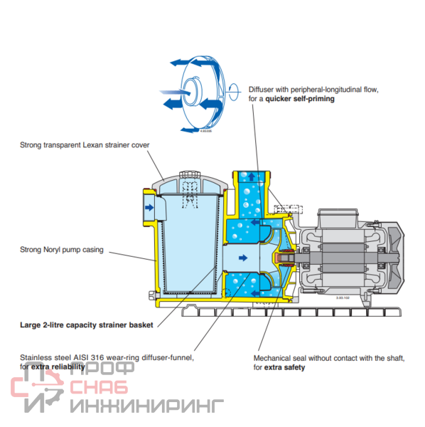 Самовсасывающие насосы для бассейнов Calpeda MPC 51/A относятся к категории специализированного насосного оборудования сделанного в Италии, которое отлично зарекомендовало себя в реализации задач по перекачке воды в установках фильтрации бассейнов. Мощность индукционного двухполюсного энергоэффективного двигателя класса IE3 насосов Calpeda серии MPC составляет 1.1 кВт при напряжении 380 В и частоте вращения ~2900 оборотов в минуту. Защита электродвигателя класса — IPX4. Оборудование укомплектовано встроенным предварительным фильтром с водозащитной изоляцией, что обеспечивает длительный рабочий ресурс насосов и бесперебойное функционирование.