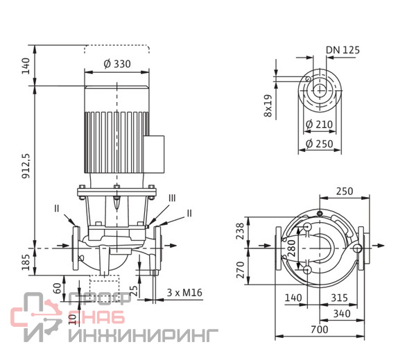 | Присоединение на напорной стороне | Фланцевое DN125 |