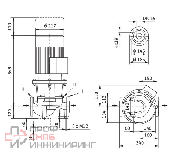 Одноступенчатый центробежный насос с сухим ротором линейного типа, предназначенный для установки в трубах или на фундаменте. Блочная конструкция с низким уровнем шума и вибрации, с фонарем и неподвижно присоединенным стандартным электродвигателем с фланцевым креплением (стандартный электродвигатель). С не зависящим от направления вращения скользящим торцевым уплотнением в кожухе с принудительным охлаждением и снижающим кавитацию рабочим колесом. Фланцы имеют штуцеры R 1/8 для измерения давления.