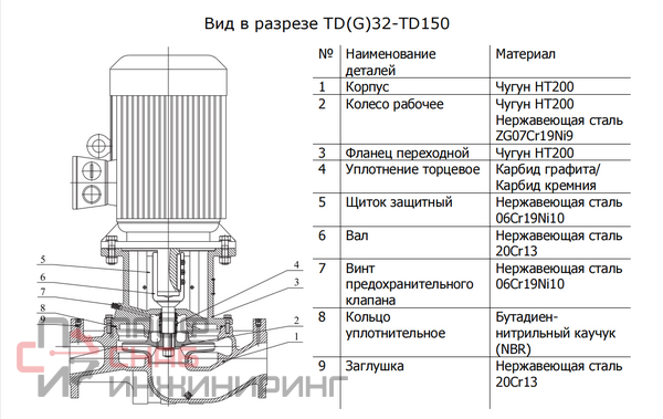 Насосы серии TD - это одноступенчатые центробежные вертикальные насосы типа «in line», которые оборудованы стандартным электродвигателем и торцевым уплотнением. Конструкция данных насосов с «сухим» ротором делает их менее чувствительными к включениям в перекачиваемой среде по сравнению с подобными насосами с «мокрым» ротором. Насосы сконструированы так, чтобы их можно было снять с трубопровода без разборки системы. Следовательно, даже для самых больших сервисные работы могут быть проведены лишь одним человеком.