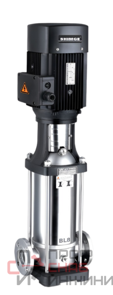 Многоступенчатый центробежный вертикальный насос с патрубками в линию. Использование в качестве оборудования для подачи жидкости под большим давлением.