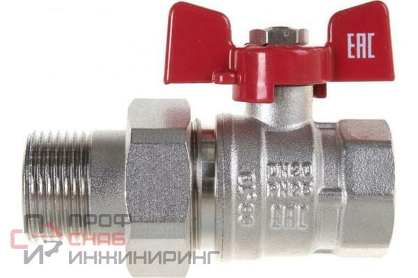 Корпус крана выполнен из высокопрочной никелированной латуни марки CW617N, методом горячей штамповки.Шток вставлен изнутри крана, что исключает выбивание штока давлением.Рукоять «бабочка» выполнена из литого алюминия и открашена в белый цвет эмалью, устойчивой к истиранию.На съемном патрубке разъемного соединителя крана расположено стопорное кольцо с уплотнителем из синтетического каучука для облегчения монтажных-демонтажных работ.