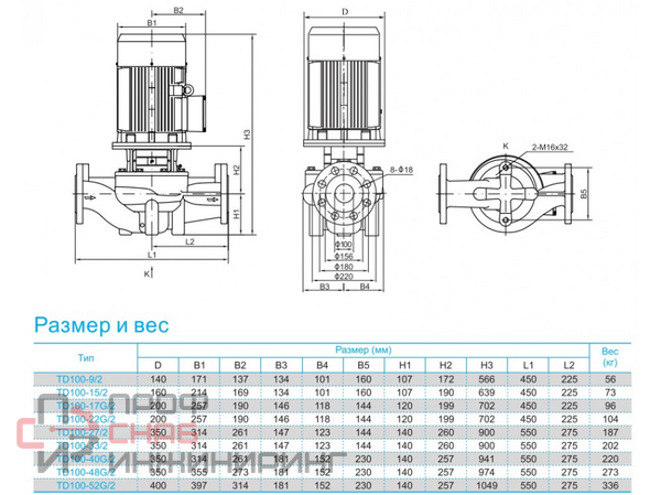 CNP серии TD100-15/2 это вертикальные одноступенчатые насосы типа ин-лайн центробежные, с сухим ротором, нормальным всасыванием, с патрубками в одну линию.