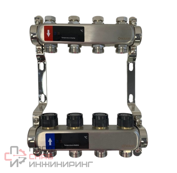 Коллекторный блок из нержавеющей стали служит для распределения потоков по контурам теплого пола, радиаторного отопления, прочих климатических систем, где в качестве теплоносителя используется вода либо незамерзающие растворы гликоля с максимальной рабочей температурой 90 °С, рабочим давлением до 9 бар.