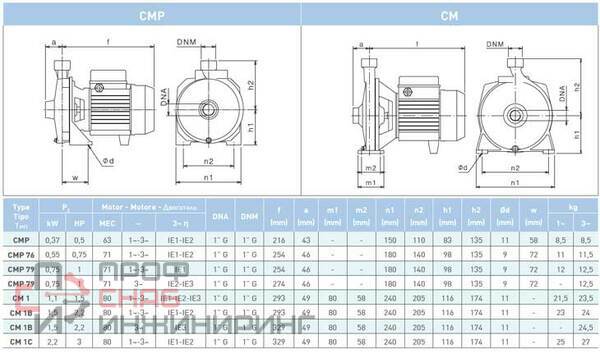 Насосные агрегаты типа СМР - центробежные моноблочные одноступенчатые насосы с непосредственной посадкой рабочего колеса на вал электродвигателя. Насосы данного типа спроектированы для обеспечения низкого и среднего напора при небольших расходах жидкости. Всасывающий и наспорный патрубки - резьбовые. Детали проточной части корпуса насоса выполнены из чугуна. Уплотнение вала - торцевое. Насосы пригодны для горизонтальной и вертикальной установки (при условии, что электродвигатель находится в верхней части). Насосы предназначены для перекачивания чистой, химически нейтральной по отношению к материалам насоса жидкости, без твердых и волокнистых включений.