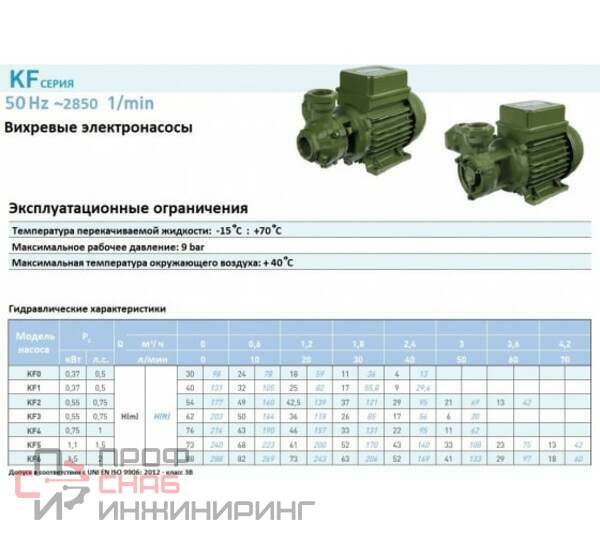 Вихревой насос с резьбовыми патрубками SAER KF 5 предназначен для подачи воды в промышленных системах, коммунальном и сельском хозяйстве. Насос может использоваться для подачи холодной или горячей воды температурой от -150C до +700C. Насос KF 5 подходит для перекачивания чистых, химически нейтральных по отношению к материалам насоса, без длинноволокнистых включений. Установка насоса KF 5 горизонтальная, электродвигатель закрытого типа с принудительным охлаждением, пригоден для использования с частотным преобразователем (инвертером), с электронными блоками управления или механическими реле давления. Всасывающий и напорный патрубки - резьбовые.