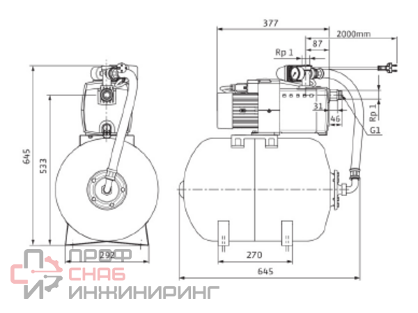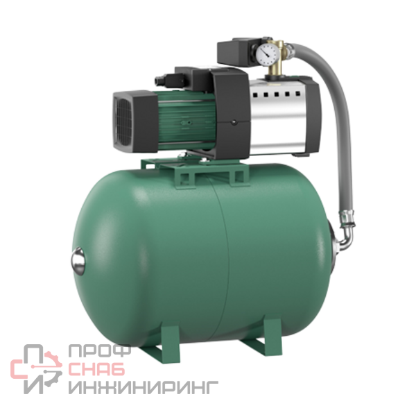 Установка водоснабжения для перекачивания дождевой и технической воды из резервуаров, прудов, ручьев и колодцев.Для водоснабжения, ирригации, полива и орошения в жилищном хозяйстве.Готовый смонтированный блок с электропроводкой, состоящий из многоступенчатого горизонтального центробежного насоса с сухим ротором, самовсасывающего, с непосредственно прифланцованным электродвигателем (не требующее обслуживания скользящее торцовое уплотнение в месте прохода вала), а также мембранным напорным баком.Напорный бак оснащен прочной заменяемой мембраной из EPDM с высокими рабочими характеристиками.Двухполюсный однофазный электродвигатель с кабельным вводом, конденсатор в соединительной коробке, защитный выключатель электродвигателя с автоматическим повторным включением, манометром, манометрическим выключателем, гибким напорным шлангом и сетевым кабелем со штекером.