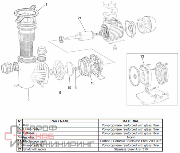 Горизонтальный самовсасывающий центробежный насос для плавательных бассейнов с встроенным фильтром грубой очистки.