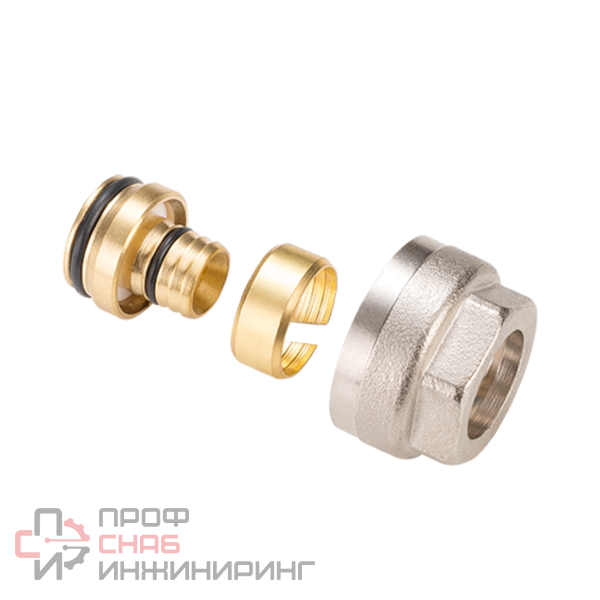 Латунный фитинг с накидной гайкой, обжимным кольцом и резиновым уплотнением предназначен для подключения металлополимерных и труб из сшитого полиэтилена диаметром 16 мм и толщиной стенки 2,2 мм к выходу коллектора или патрубку иной арматуры диаметром 3/4", стандарт соединения – «евроконус». Входит в ассортимент системы аксиальных фитингов.