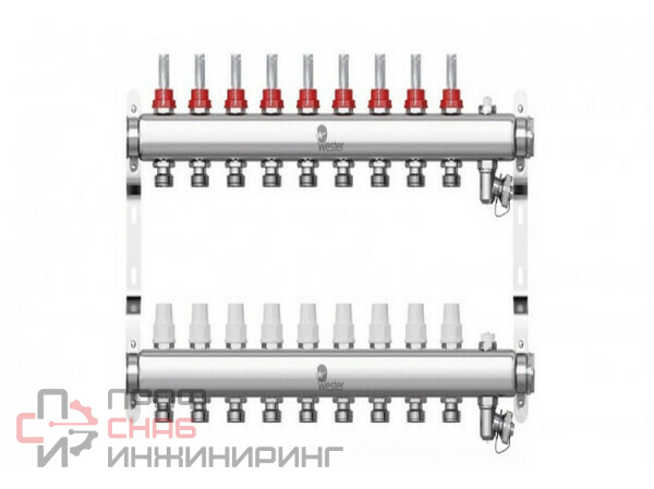 Коллекторы Wester W902 из нержавеющей стали с расходомерами и запорными клапанами предназначены для оптимизации и контроля распределения теплоносителя в системах радиаторного отопления и подогрева пола. Поставляются с расходомерами в предварительно собранном виде. Укомплектованы кронштейнами для крепления в распределительном шкафу или на стене, воздухоотводчиками для удаления воздуха и дренажными кранами для операций заполнения/слива системы. На подающем коллекторе установлены регуляторы расхода, на коллекторе обратки установлены запорные клапаны.