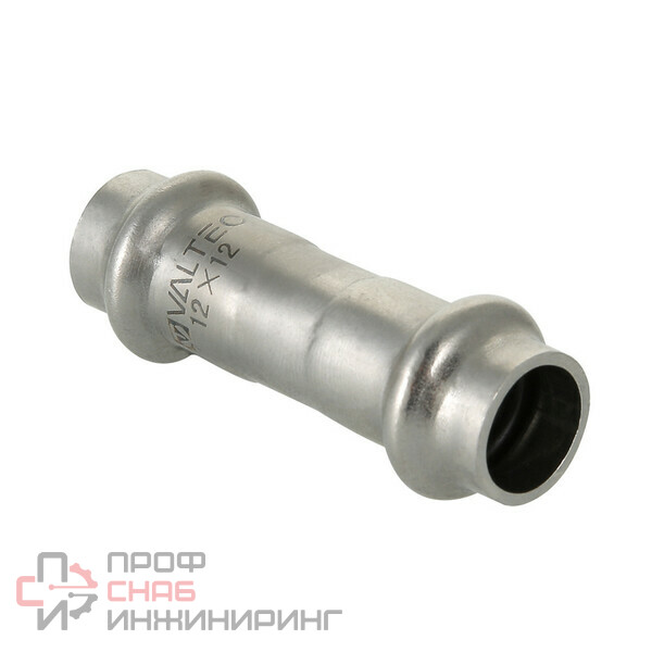 Двухраструбная пресс-муфта из нержавеющей стали предназначена для соединения тонкостенных стальных труб в системах водоснабжения, отопления, других инженерных и технологических установках с рабочей температурой до 120 °С. Номинальное давление – 16 бар.Муфта VTi.903.l изготовлена из стали AISI 304. Материал уплотнительных колец – эластомер EPDM. Отдельно можно приобрести уплотнительные кольца из FPM (витон); в этом случае максимальная рабочая температура увеличивается до 140 °С. Достоинством бесштуцерных соединителей является малый коэффициент местного сопротивления (сужение канала практически отсутствует). Фитинг рассчитан на обжатие с помощью пресс-инструмента V-профиля.