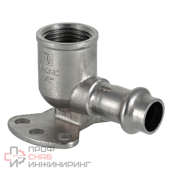 (VTi.954.I) Пресс-угольник из нержавеющей стали с переходом на внутреннюю резьбу и креплением (водорозетка) обеспечивает соединение тонкостенной стальной трубы с резьбовым элементом (в частности, патрубком сантехнического смесителя) монтируемой системы под углом 90°. Область применения пресс-водорозетки из нержавеющей стали – трубопроводы водоснабжения, отопления, иные инженерные и технологические установки с рабочей температурой до 120 °С и давлением до 16 бар.Изделие изготовлено из стали AISI 304. Материал уплотнения – эластомер EPDM. Отдельно можно приобрести уплотнительные кольца из FPM (витон); в этом случае максимальная рабочая температура увеличивается до 140 °С.Пресс-соединение – бесштуцерное. Обжатие производится с помощью пресс-инструмента V-профиля.