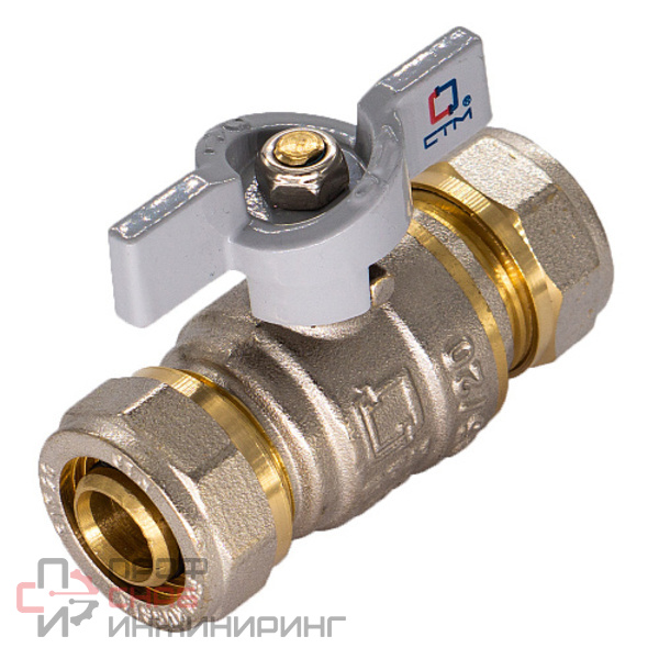 Кран шаровой для воды 20х20 CTM СТАНДАРТ с цангой (обжимными соединениями), ручкой-бабочкой применяется в качестве запорной арматуры на трубопроводах систем питьевого, хозяйственно-бытового и промышленного назначения, систем холодного, горячего водоснабжения и отопления, а также трубопроводах, транспортирующих среды, не агрессивные к материалам крана в составе инженерных систем и технологических установок на основе металлопластиковых труб. Не предназначен к применению на стояках, магистральных трубопроводах и участках систем, в которых могут возникнуть изгибающие усилия, передаваемые на корпус крана.