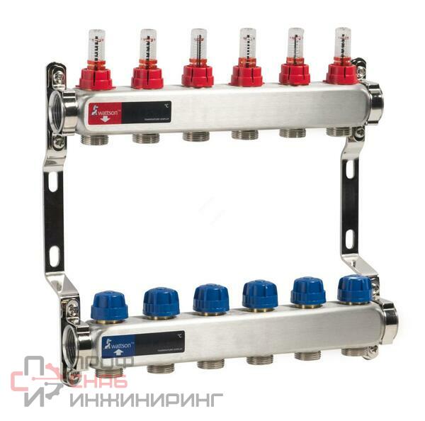 Изготовлен из нержавеющей стали с расходомерами на подающем коллекторе и термостатическими вентилями на обратном коллекторе. Термометры расположены на подающем и обратном коллекторе. Кронштейн в комплекте Максимальное рабочее давление: 6 бар. Расходомеры: расход от 0 до 5 л/мин. Рабочая температура: от +5°C до +70°C.
