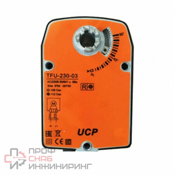 Привод UCP TFU-230-03 3 Нм / 230 В с возвратной пружинойUCP TFU-230-03 - электромеханический привод воздушного клапана, применяемый для двухпозиционного управления заслонкой. Регулирующий электропривод выполнен в металлическом корпусе со степенью защиты IP54 и соответствует Российским стандартам.Электропривод UCP TFU-230-03 имеет возвратную пружину и двигатель с крутящим моментом 3 Нм, этого усилия достаточно для управления воздушным клапаном с заслонкой до 0.6 м². Модель TFU-230-03 подключается к стандартной сети переменного тока с напряжением 220-240В 50/60 Гц.