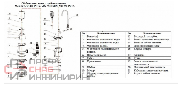 Насосы моделей MW 400 INOX, MW 550 INOX, MQ 750 INOX предназначены для перекачивания пресной чистой, загрязненной, дренажной, дождевой и хлорированной воды или других жидкостей с такими же физическими и химическими свойствами. Они используются для перекачивания воды из колодцев, рек, прудов, бассейнов, погребов и т. д., для понижения уровня грунтовых вод, в системах полива и т. д. Диаметр подключения регулируется: 25/32/40 мм.