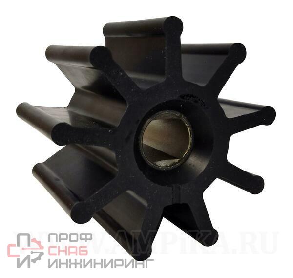 Крыльчатка из резины EPDM (этилен-пропиленавая резина). Вставка - из нержавеющей стали марки AISI 316, для предотвращения проворачивания на ведущем валу на ней сделаны два шлица.Насос с этим импеллером может использоваться для щелочных жидкостей. Рабочая температура от -40С до +120С.На фотографии видны точки на концах лучей шестерёнки - это литники. Рядом с центральной втулкой в резине сделано углубление для подвода жидкости внутрь крыльчатки для смазки и охлаждения.