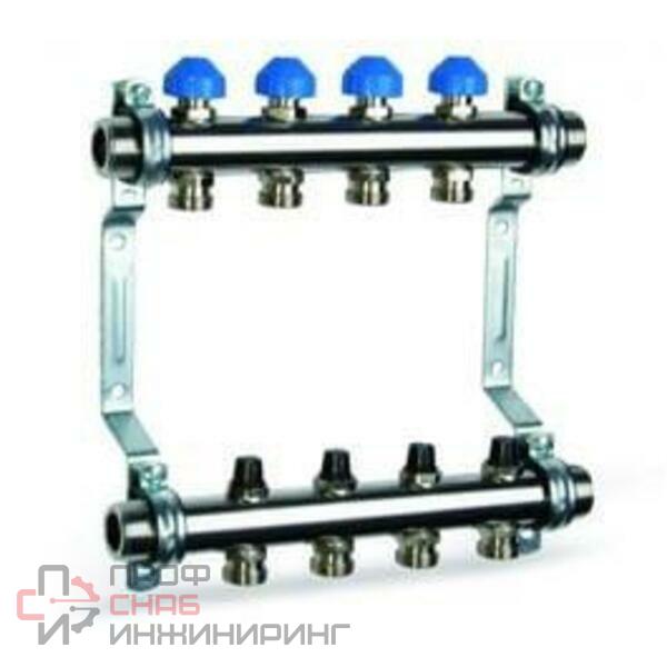 Коллектор 1" для напольного отопления, состоящий из двух патрубков из нержавеющей ста ли круглого сечения, смонтированных на звукоизолирующих кронштейнах. Возможность раз но стороннего подключения (1" hР с плоским уплотнением). Выходы: 3/4" НР с евроконусом, рас стояние между от водами 55 мм. Минимальная величина заглубления при скрытом монтаже.Подающий патрубок: контрольно-регулирующие и запорные вентили тонкой балансировки. Обратный патрубок: контрольно-регулирующие и запорные вентили на сервопривод (m30x1,5).