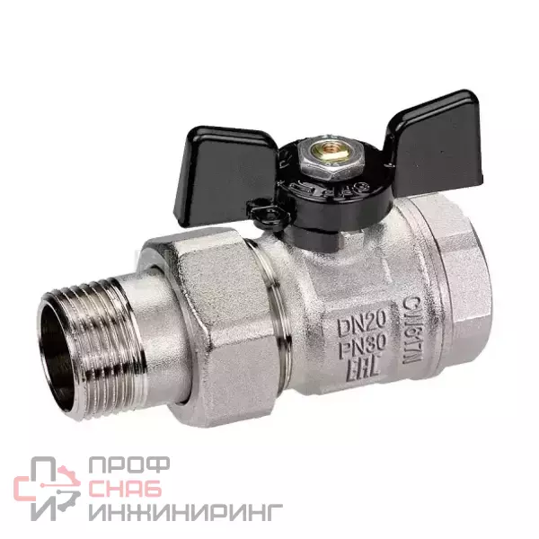 Кран шаровой латунный, полнопроходной, резьбы наружная - внутренняя с соединителем с накидной гайкой по ISО 228/1. Ручка - «бабочка» из алюминия UNI-EN 1706, покрытие - эпоксидная эмаль черного цвета.
