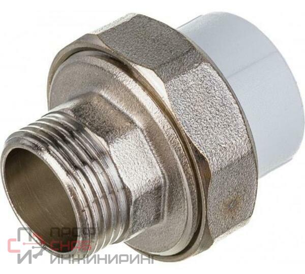 Муфта комбинированная разъёмная (американка) с наружной резьбой — комбинированный полипропиленовый фитинг. Представляет собой разъемное соединение между металлической и пластиковой трубой. Латунные части производятся методом горячего штампования, пластиковые - методом литья под давлением.