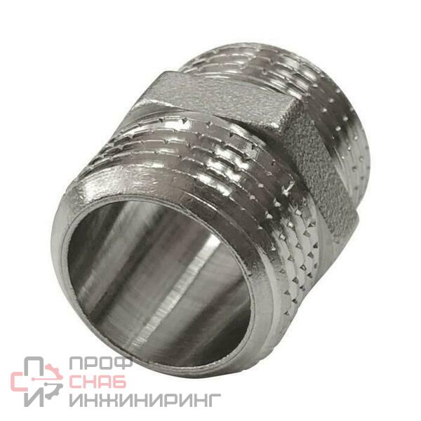 Ниппель с никелевым покрытием (наруж.-наруж.) – латунный фитинг, представляющий собой изделие с наружной резьбой на обоих концах, с помощью которых он соединяется с другими участками трубопровода равного диаметра, резьба цилиндрическая трубная по ГОСТу 6357-81. Предусмотрен участок корпуса шестигранной формы, под гаечный ключ. Фитинги рассчитаны на рабочее давление (PN) 2,5 и 4,0 МПа и температуру транспортируемых сред от -20 до +150 °С.