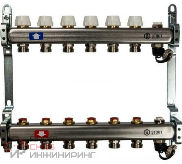 Коллектор из нержавеющей стали без расходомеров, с клапаном выпуска воздуха и сливом STOUT 6 выходов SMS-0932-000006 - это прочное приспособление, которое подключается в системы водяного отопления или теплого пола. Изделие распределяет теплоноситель на узлы системы. Данная модель подразумевает работу с 6 узлами.