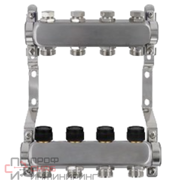 Коллекторный блок из нержавеющей стали служит для распределения потоков по контурам теплого пола, радиаторного отопления, прочих климатических систем, где в качестве теплоносителя используется вода либо незамерзающие растворы гликоля с максимальной рабочей температурой 90 °С, рабочим давлением до 9 бар.