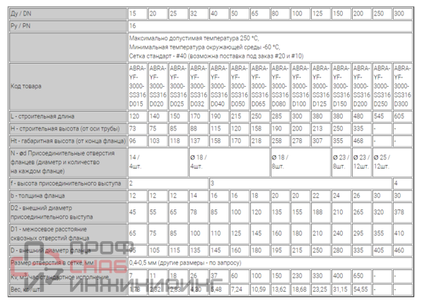 Корпус - SS316. Сетка - нержавеющая сталь. Присоединительные отверстия фланцев по ГОСТ в РN 16 и PN 10 для DN15-150 совпадают. ГОСТ-а на строительные длины на фильтры не существует. Рабочие среды и применения: - для пара, паровых систем (паровых линий, паропроводов) до 250°C, для конденсатных линий, для аммиака, для газопроводов нейтральных и инертных газов, включая природный (натуральный) газ, для систем водоподготовки и водозабора, для воды, в том числе технической, питьевой, сетевой, подпиточной, диситиллированной и т.д., для многих солевых водных растворов, для транспортировки минеральных и синтетических масел, для работы при температуре до -60°С, для многих других применений в соответствии с конструкцией и материалами фильтра.