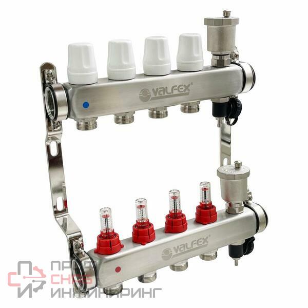 Коллекторная группа из нержавеющей стали со встроенными расходомерами и регулирующими клапанами ТМ VALFEX – позволяет производить балансировку петель при включенном циркуляционном насосе с помощью настроечных клапанов без фиксации, с расходомерами. В комплекте имеются автоматические воздухоотводчики, позволяющие удалять из системы накопление воздуха и газов.Коллекторная группа состоит из подающего и обратного коллекторов из нержавеющей стали, ручных настроечных клапанов c расходомерами, регулирующих клапанов (с возможностью установки электротермических сервоприводов), автоматических воздухоотводчиков, дренажных клапанов и крепежных кронштейнов.Коллекторные блоки могут работать как на водяном, так и низкозамерзающем (гликолевом) теплоносителе.