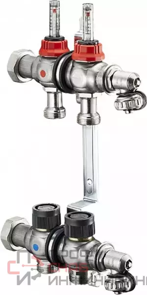 Коллектор состоит из подающей и обратной части коллектора, кронштейна для крепления со звукопоглощающими хомутами, бокового поворотного узла с воздухоотделителем, штуцера подачи /слива и заглушкой 3/4". Подающие части коллектора оснащены регулируемыми расходомерами со шкалой от 0 до 5 л/мин для балансировки расхода в каждом контуре. Обратные части коллектора могут быть оборудованы сервоприводами (сервомоторами) при автоматическом регулировании.