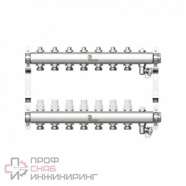 Коллектор Wester из нержавеющей стали с регулирующими и запорными клапанами, предназначен для оптимизации в системах радиаторного отопления и подогрева пола. Укомплектован кронштейнами для крепления в распределительном шкафу или на стене, переходниками, воздухоотводчиками для удаления кислорода и дренажными кранами для операций заполнения/слива системы. Присоединение 3/4" под "евроконус". На каждой отходящей линии распределителя установлен регулировочный клапан. На каждой входящей линии распределителя обратки установлен запорный клапан.