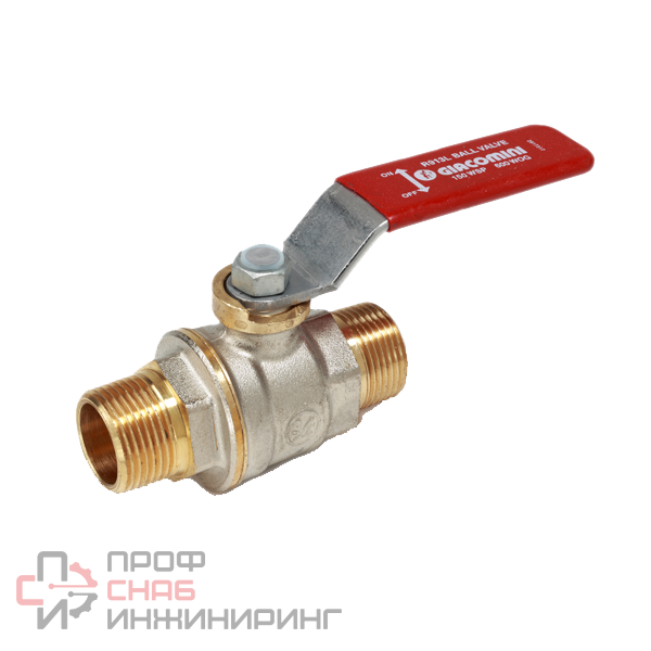 Шаровой кран, никелированный, с красной рычажной рукояткой, соединение с внешней резьбой.