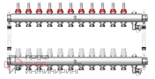 Коллектор Wester из нержавеющей стали с регулирующими и запорными клапанами, предназначен для оптимизации и контроля распределения теплоносителя в системах радиаторного отопления и подогрева пола. Укомплектован кронштейнами для крепления в распределительном шкафу или на стене, переходниками, воздухоотводчиками для удаления кислорода и дренажными кранами для операций заполнения/слива системы. Присоединение 3/4" под "евроконус". На каждой отходящей линии распределителя установлен регулировочный клапан. На каждой входящей линии распределителя обратки установлен запорный клапан.