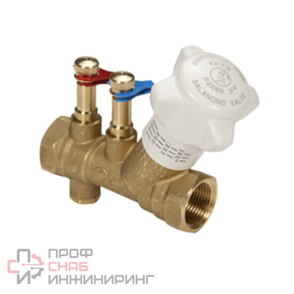 Статический балансировочный клапан с фиксированным проходом (основан на принципе Вентури). Латунный корпус с внутренней - внутренней резьбой и сливом. Рукоятка из пластика ABS с нанесенным значением KV устройства Вентури. Возможность регулировки с блокировкой установленной настройки (механическая память). Доступны в модификациях с штуцерами для измерения дифференциального давления, или без них. Максимальная рабочая температура 110°С. Максимальное рабочее давление 25 бар.