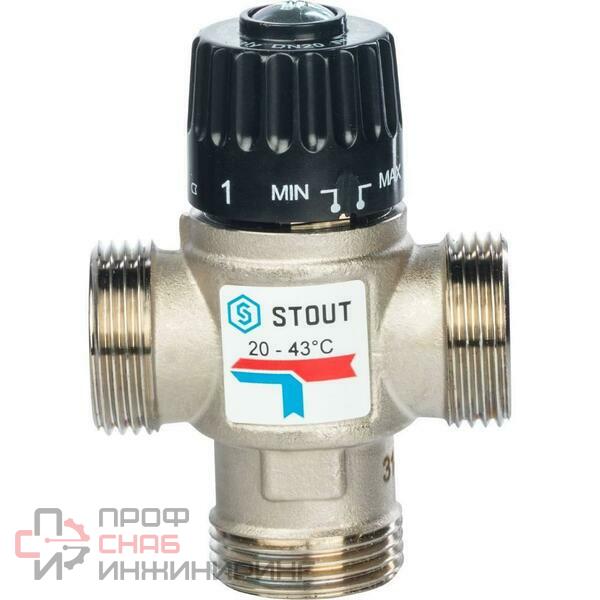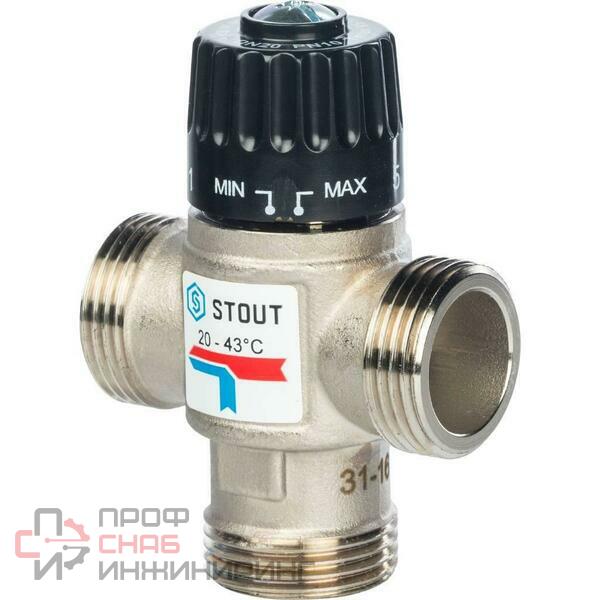 Термостатический смесительный клапан Stout 1" НР 20-43 °С, KV 2,5 м3/ч (SVM-0020-254325) с боковым смешением предназначен для применения в системе горячего водоснабжения, в системах «тёплый пол», а также в других системах отопления с постоянной температурой теплоносителя. Рабочей средой может выступать вода и водные растворы гликолей (до 30%) с максимальной температурой +95°C. Давление в системе не должно превышать 10 бар.